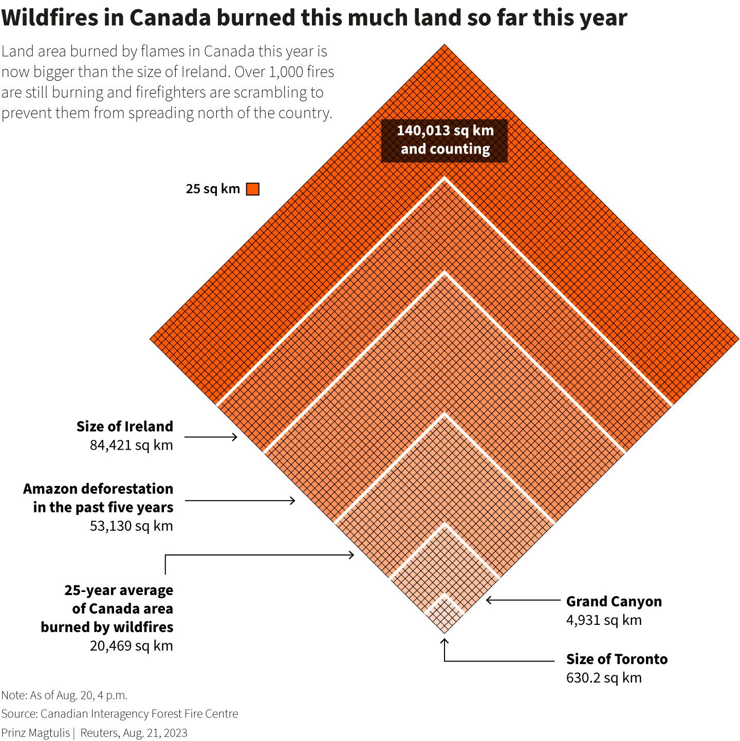 It should be clear now that when we see warning signs, like certain areas of the Amazon rainforest becoming a source of carbon or four out of five emperor penguin colonies in Antarctica’s Bellingshausen Sea losing their chicks, we should take decisive action because the impacts could spiral far beyond what we’ve modeled and what initially comes to mind. We’ve only been modeling the impacts conservatively, due to the consensus approach of the IPCC, the conservative nature of science, and the fact that we have an incomplete understanding of all of the infinite elements that affect and are affected by the climate. But this summer is previewing the true scale of the cost of inaction (a great chart on the size of Canada’s fires so far this year if you’re a visual person below), and it’s only going to get worse. We’re running out of time and every tenth of a degree counts.
